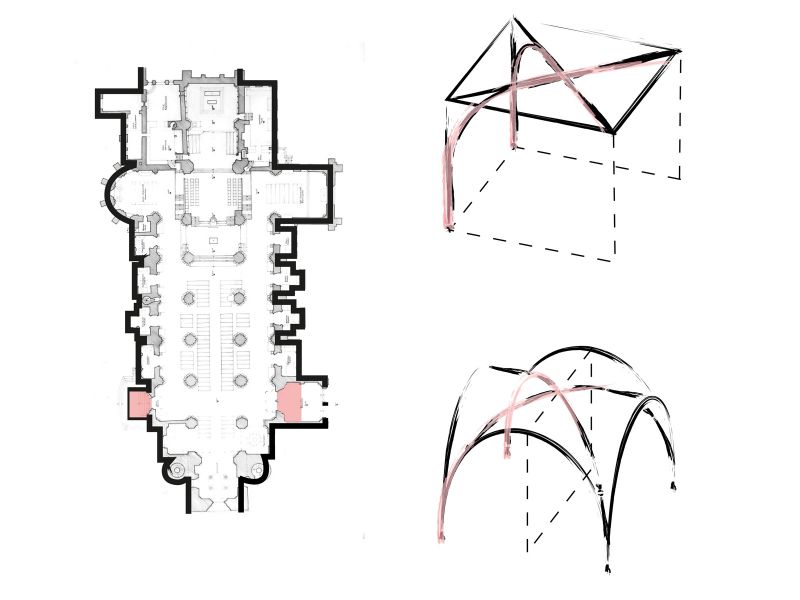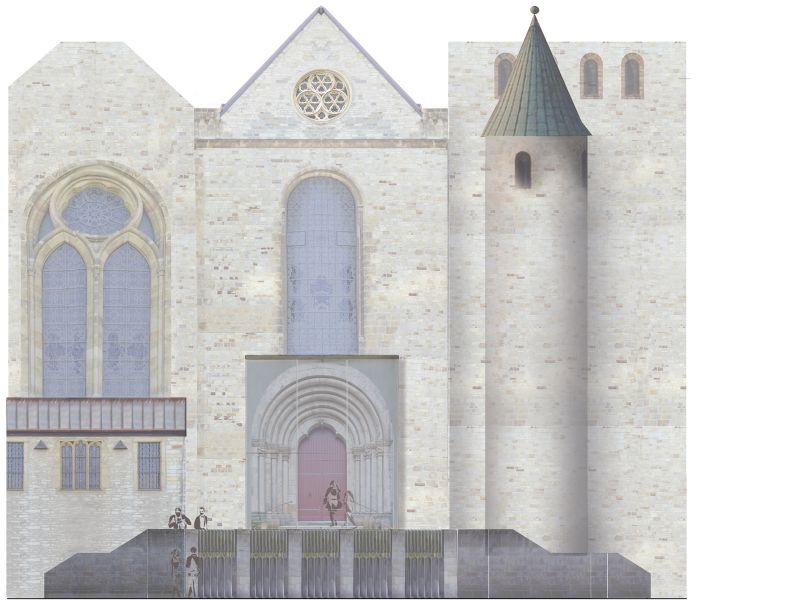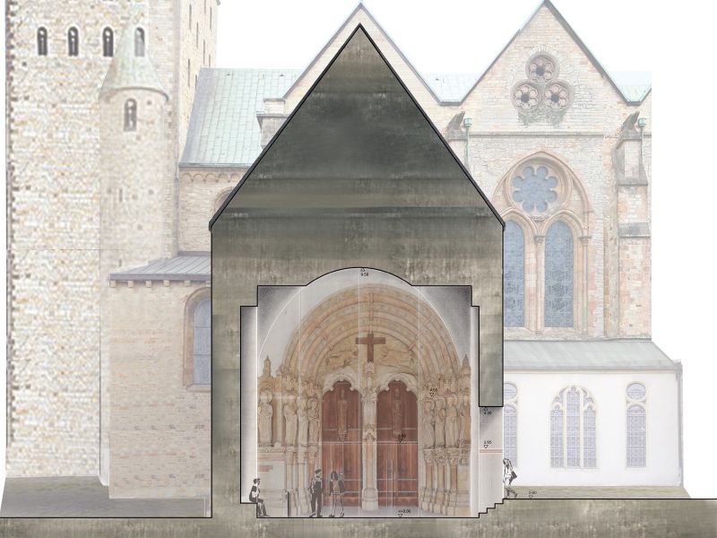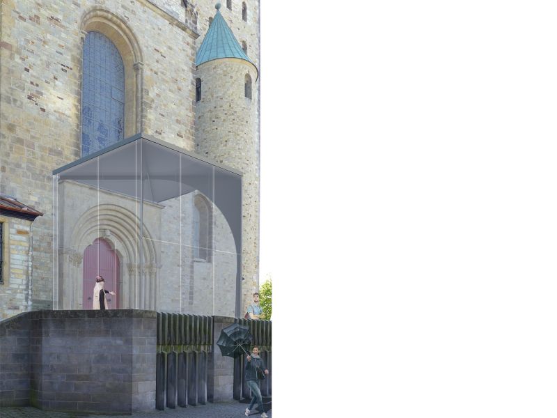 Wir betrachten den Hohen Dom zu Paderborn und sein unmittelbares Umfeld als untrennbares Ganzes und schlagen eine konzeptionell geprägte Lösung vor, die Behutsamkeit, Funktionalität und gestalterischen Anspruch vereint. Uns erscheint eine innenseitige Hinzufügung von Windfängen aus funktionalen und gestalterischen Gründen als schwierig und als typologisch nicht gerechtfertigt. Beide neue Windfänge wirken einladend, sind großzügig dimensioniert ohne zu stören und folgen einem ganzheitlichen Gestaltungsanspruch, der dem Hohen Dom zu Paderborn und dem Kontext gerecht wird.