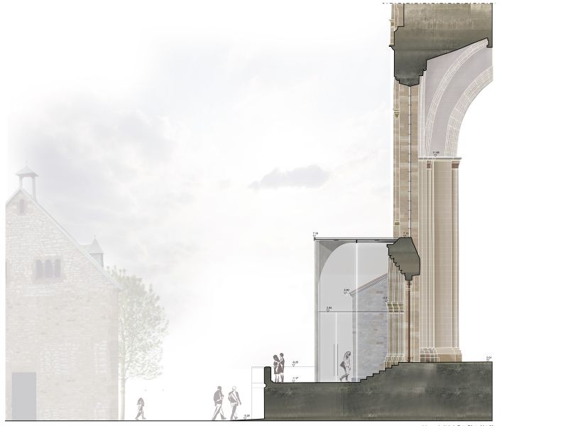 Beide Windfänge werden als Ganzglaskonstruktion ausgeführt. Glasschwerter stabilisieren in horizontaler Richtung die Glasscheiben welche – konstruktiv gesehen – von der Deckenkonstruktion vertikal abgehängt sind. In der Paradiesvorhalle trägt die Gewölbedecke, bzw. eine darüber liegende Unterkonstruktion diese Vertikallasten des Glases, während an der Roten Pforte die bogenförmigen Stahlschwerter und die Stahldecke dafür zuständig sind. Diese Konstruktionsart erlaubt maximale Transparenz und Filigranität bei den neu hinzugefügten Bauteilen, so dass der wertvolle Bestand visuell und haptisch möglichst unangetastet bleibt.